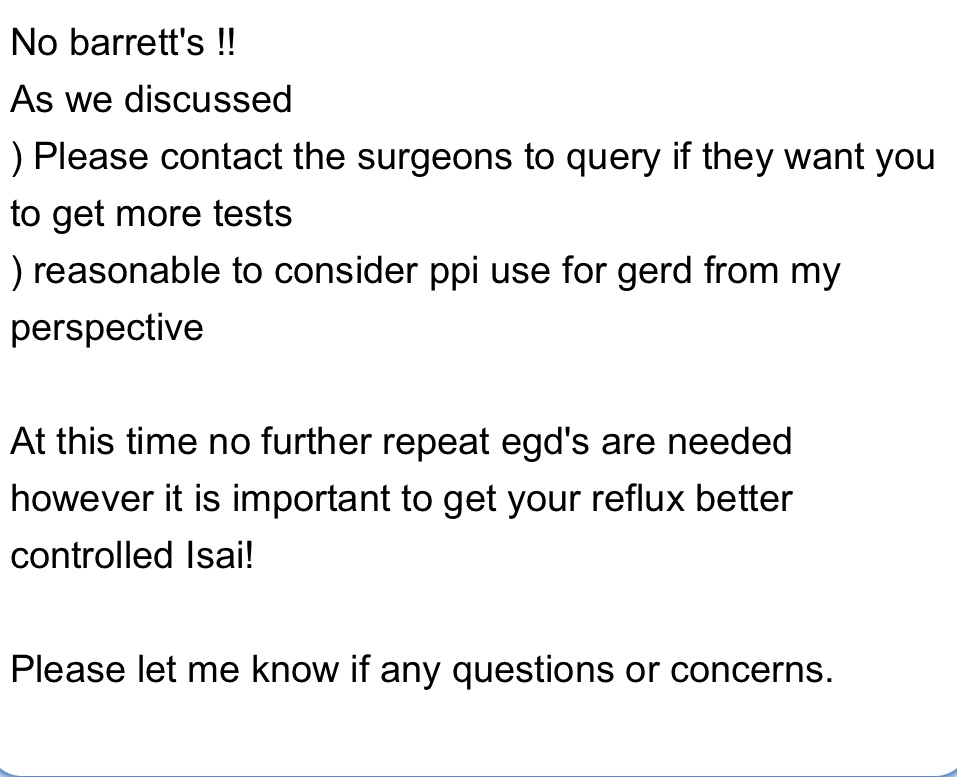 I was living with news that I had Barrett's esophagus for a year. I thought I would be playing the cancer lottery once a year, every year, for the rest of my life. I was elated to not have Barrett's esophagus, and I'm not surprised they suggested use of PPIs. However, none of this addresses the fact that most of my issues are preventable with food. None of the doctors other than Dr. Razak offer a treatment or plan to address the things we can control. The things we can change.